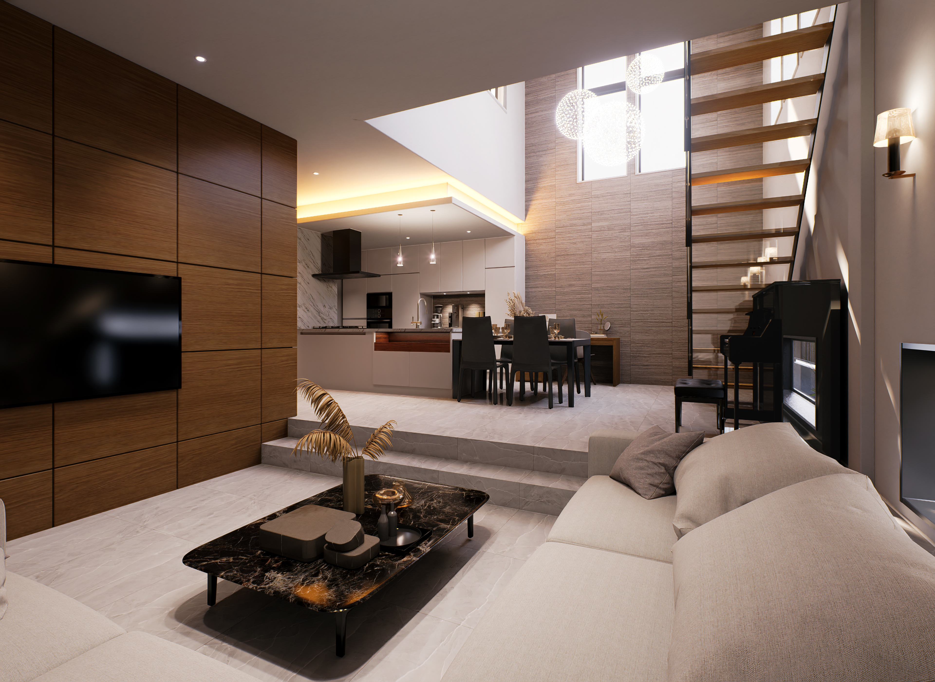 吹き抜けの開放感が心地よい、モダンで洗練されたLDK空間を表現しました。