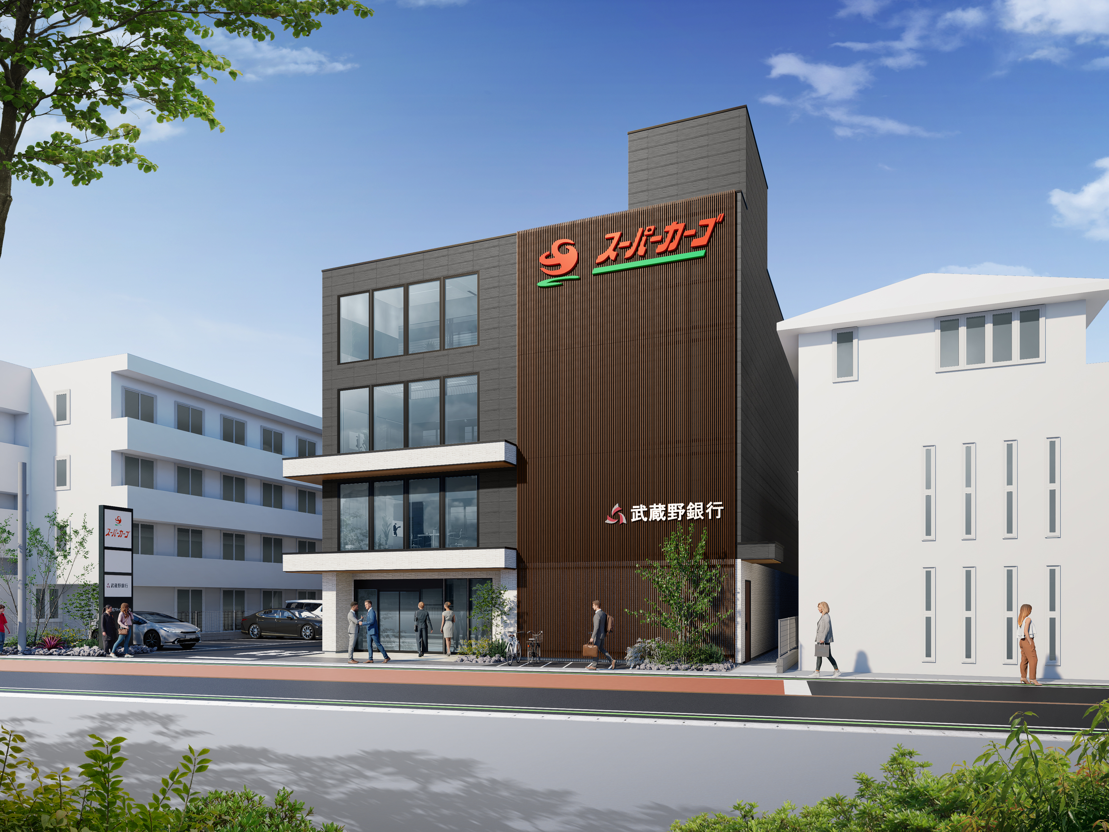 また、周辺の建物配置や道路環境、植栽まで丁寧に再現し、実際の街並みの中での建物の見え方をリアルに表現。完成後のイメージを具体的に感じられる外観パースに仕上げました。